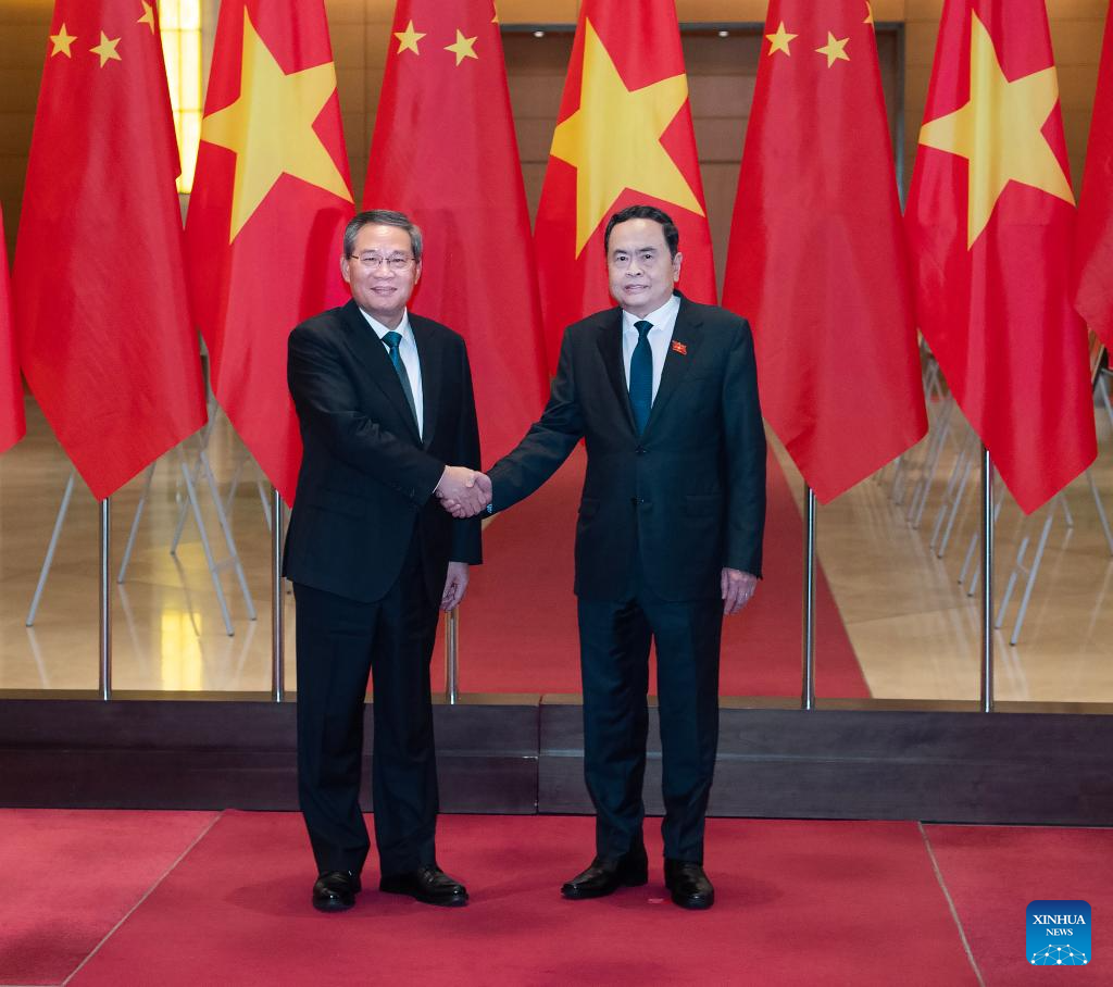 13日、チャン・タイン・マン国会議長と会談する李強総理。(ハノイ=新華社記者/丁海濤)