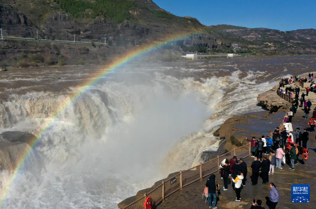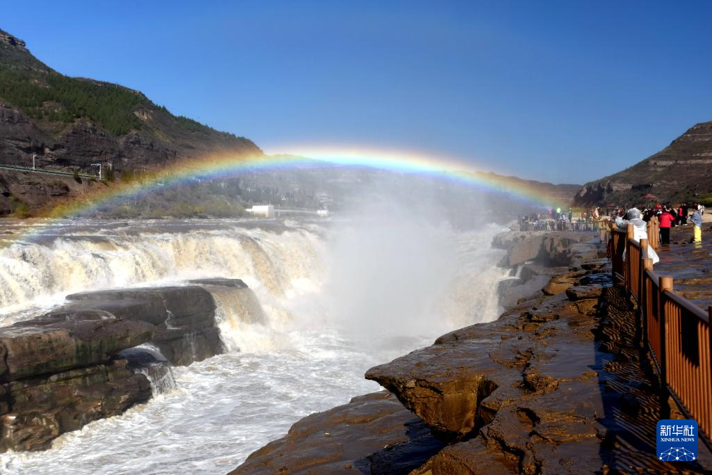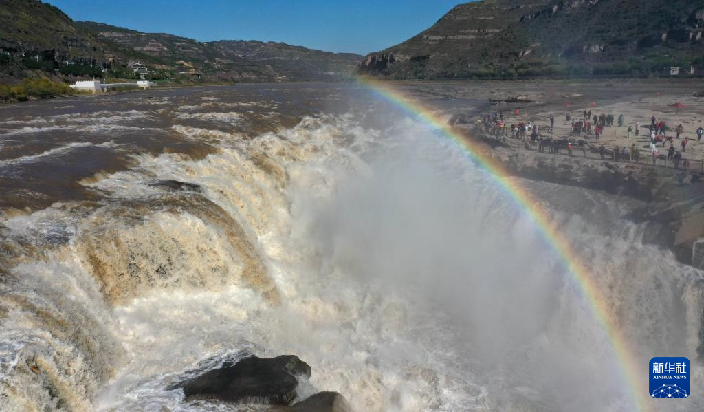 【新華社臨汾11月25日】中国山西省臨汾市吉県と陝西省延安市宜川県の境に位置する黄河壺口瀑布がこのほど、ダム放水の影響で増水し、日差しを受けた水しぶきが鮮やかな虹をつくり出した。pagebreak