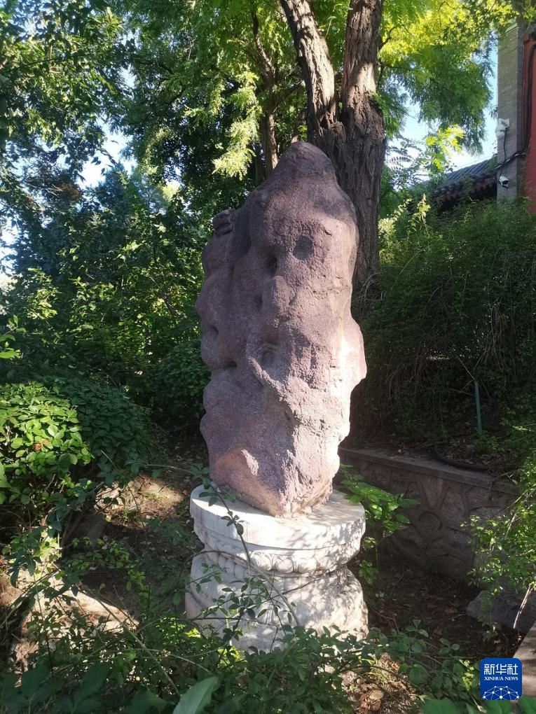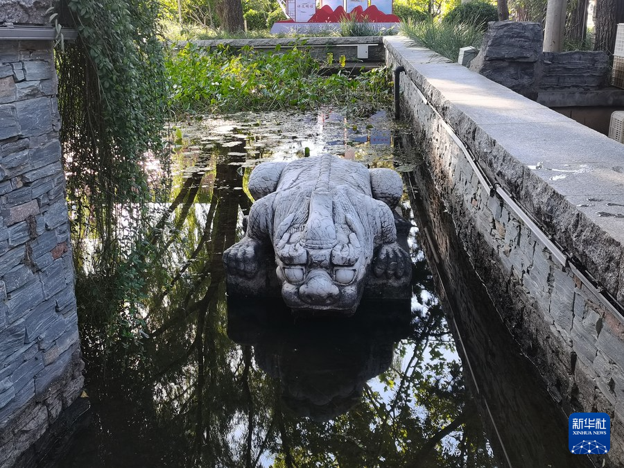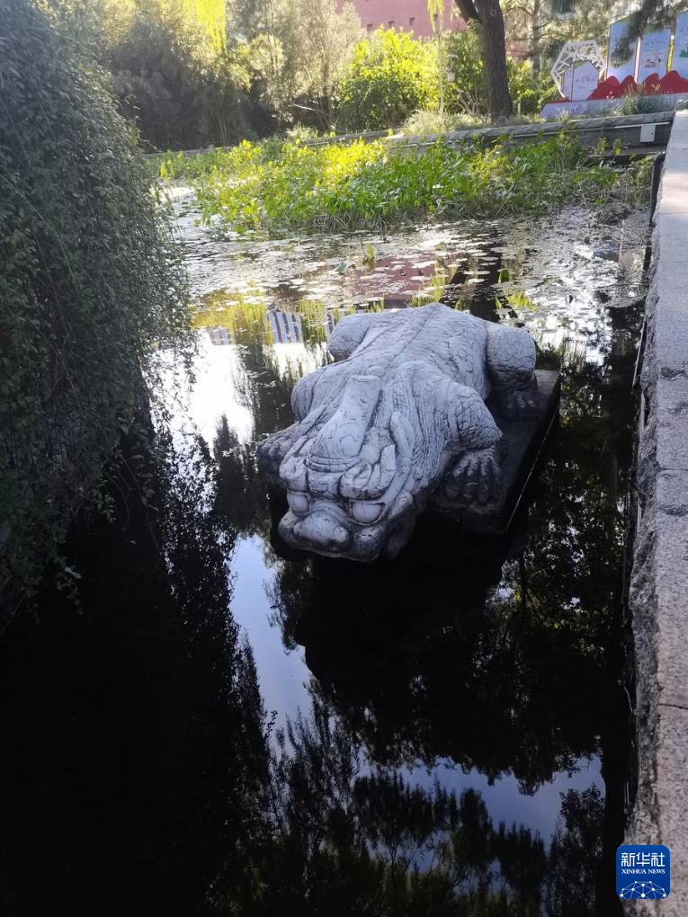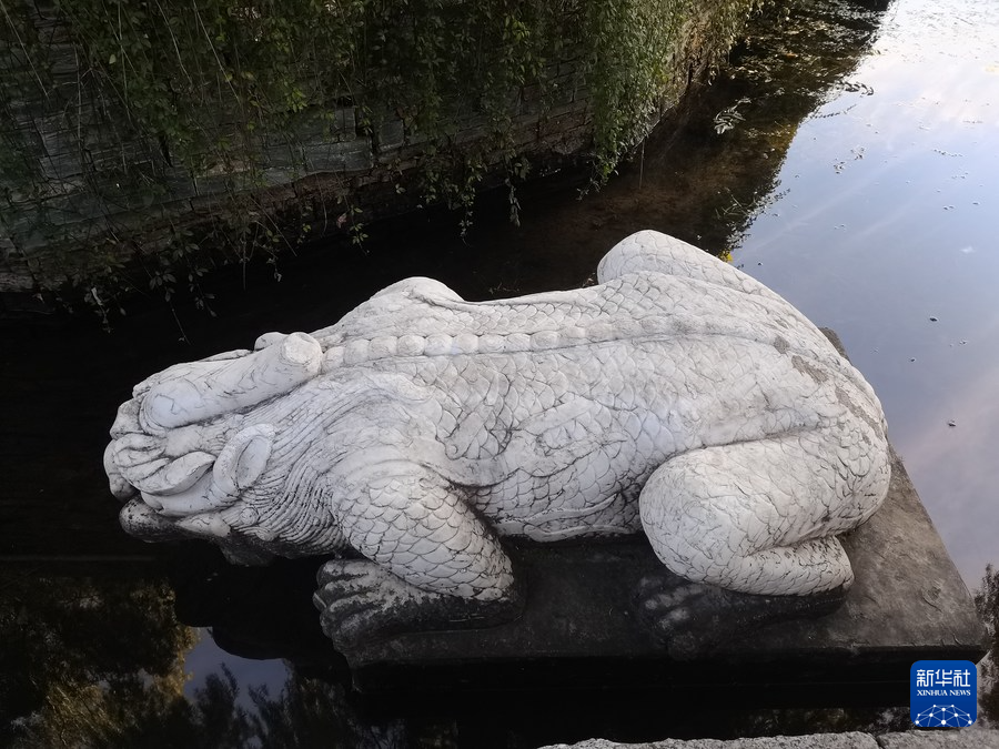 匯通祠の水路に鎮座する石製の螭。(9月22日撮影、北京=新華社記者/王巍)