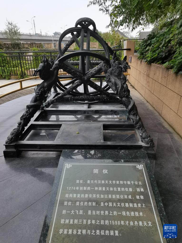 匯通祠(郭守敬記念館)の屋外に展示されている天体観測機器「簡儀」の模型。(8月23日撮影、北京=新華社記者/王巍)