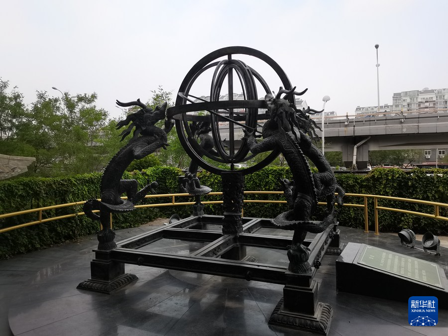 匯通祠(郭守敬記念館)の屋外に展示されている天体観測機器「渾天儀(こんてんぎ)」の模型。(8月23日撮影、北京=新華社記者/王巍)