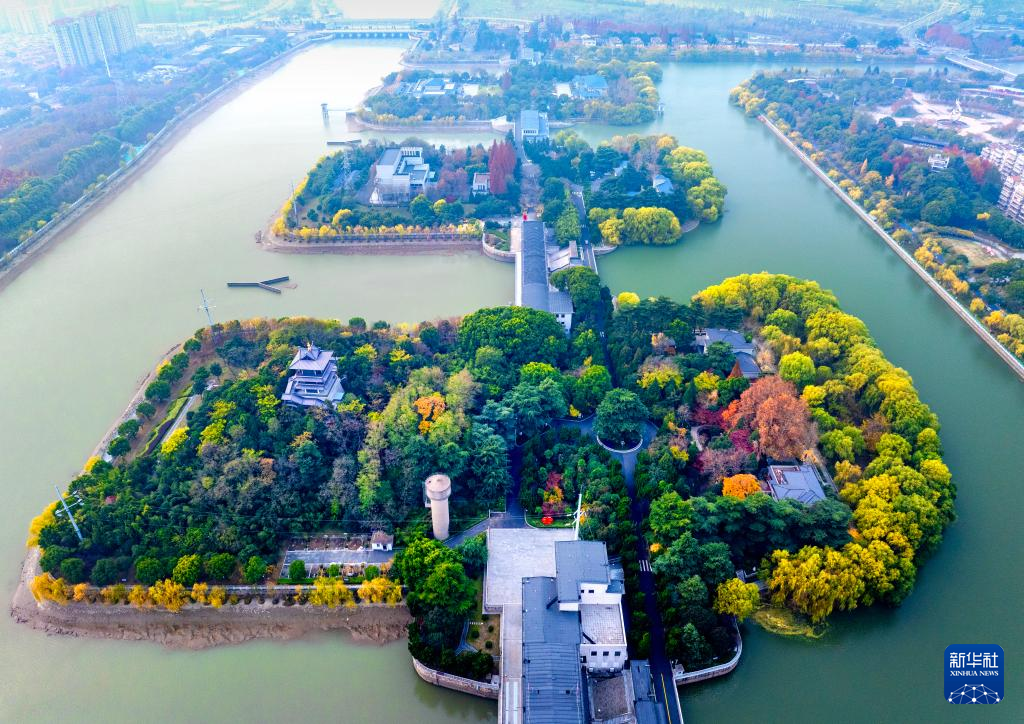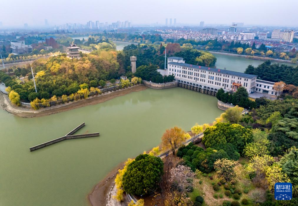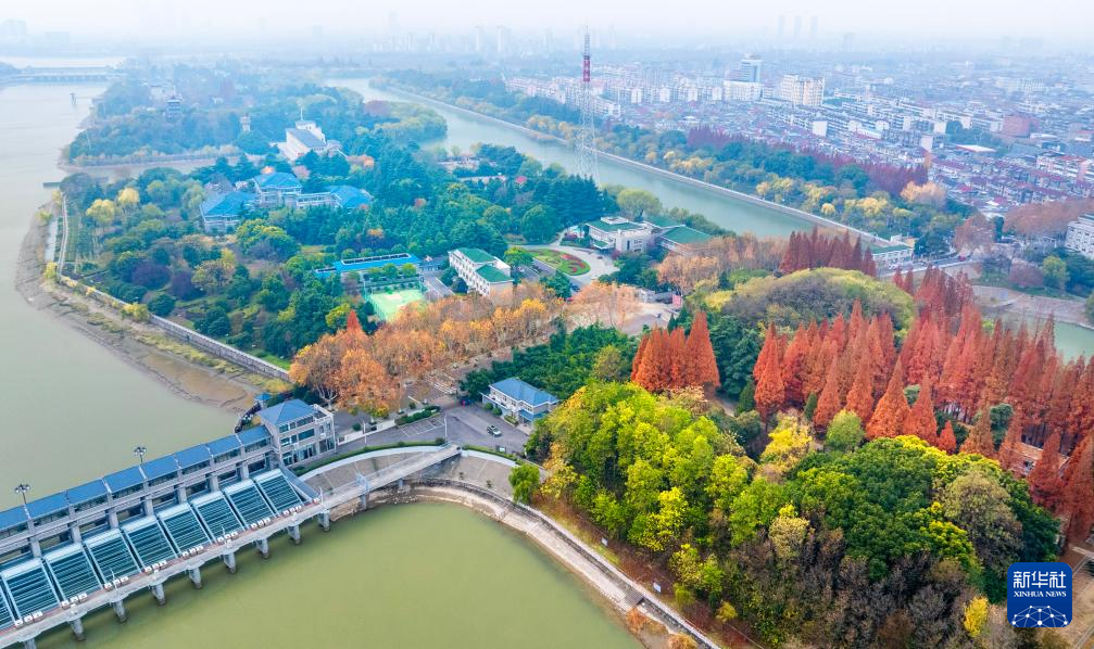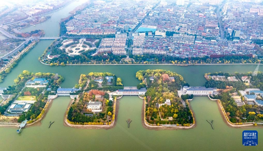 13日、江蘇省揚州市江都区にある「南水北調」東ルートの起点、江都水利ハブ。(ドローンから、揚州=新華社配信/任飛)