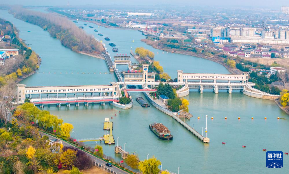 13日、江蘇省揚州市江都区にある「南水北調」東ルートの起点、江都水利ハブ東閘。(ドローンから、揚州=新華社配信/周社根)pagebreak