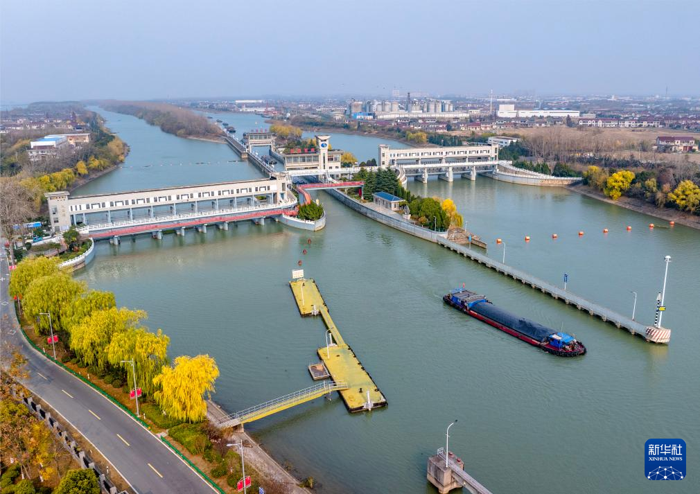 13日、江蘇省揚州市江都区にある「南水北調」東ルート第1期プロジェクトの水門。(ドローンから、揚州=新華社配信/任飛)