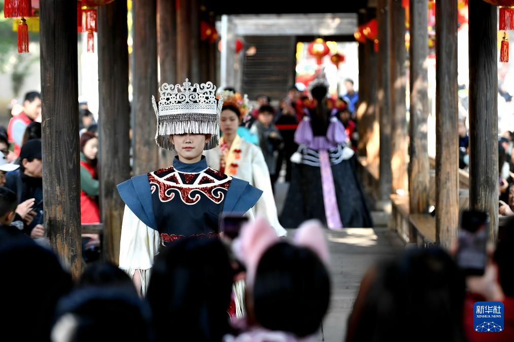 1日、三坊七巷の風雨廊で無形文化遺産の伝統衣装を披露するモデル。(福州=新華社記者/魏培全)