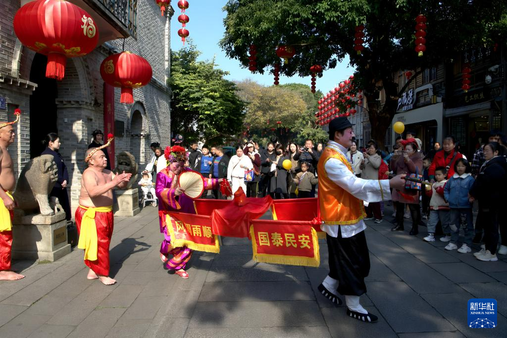 1日、三坊七巷で無形文化遺産の伝統舞踊「泉州拍胸舞」や「火鼎公火鼎婆」を見物する人々。(福州=新華社記者/魏培全)