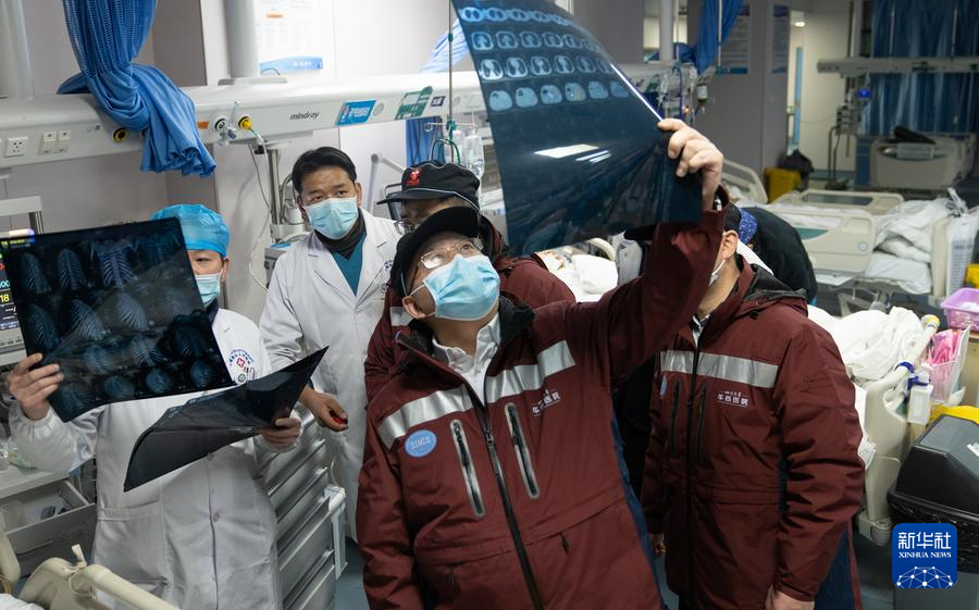 7日夜、シガツェ市人民医院で、地元の医師と共に負傷者の状態を確認する四川大学華西医院医療チームの医師(赤い服)。(ラサ=新華社記者/丁増尼達)pagebreak