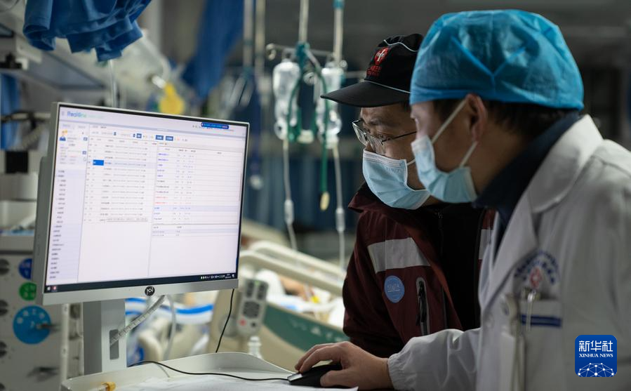 7日夜、シガツェ市人民医院で、地元の医師と共に負傷者の状態を確認する四川大学華西医院医療チームの医師(左)。(ラサ=新華社記者/丁増尼達)