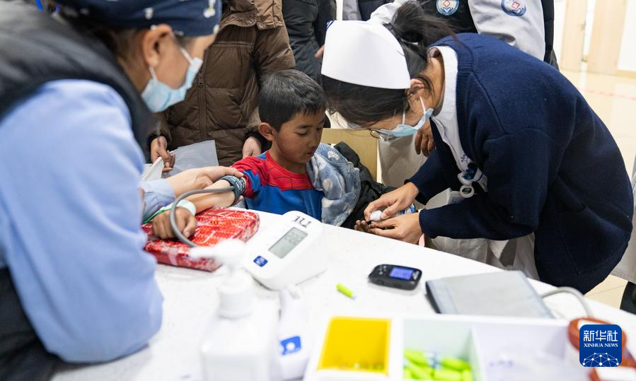 8日未明、シガツェ市人民医院で子どものけがを確認する看護師。(ラサ=新華社記者/丁増尼達)pagebreak