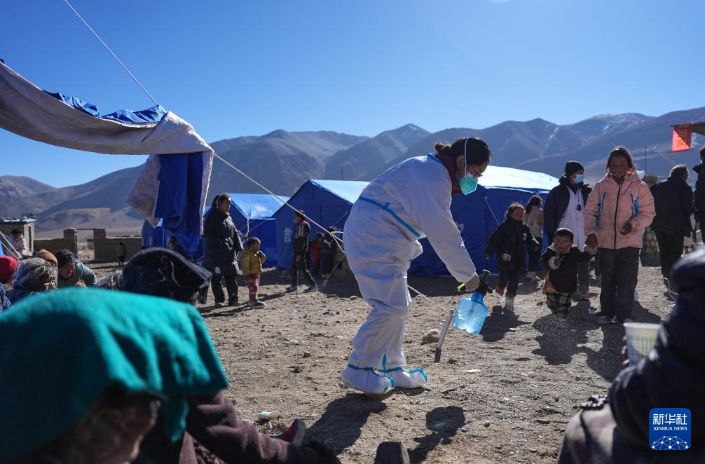 8日、ティンリ県野江村の避難所で消毒液を散布する医療従事者。(ラサ=新華社記者/晋美多吉)