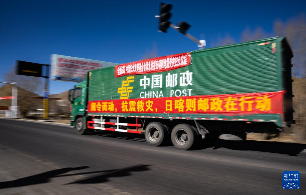 8日、被災地を目指し、シガツェ市内の国道318号線を走る中国郵政の救援車両。(ラサ=新華社記者/丁増尼達)pagebreak