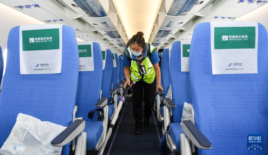 10日、三亜鳳凰国際空港でC919の機内を清掃するスタッフ。(三亜=新華社記者/楊冠宇)