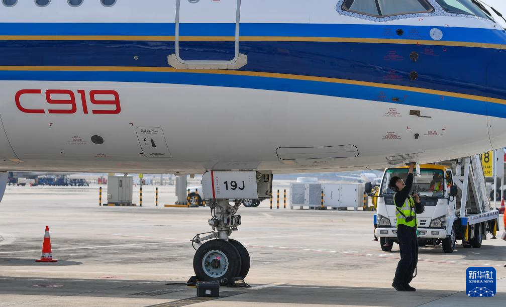 10日、三亜鳳凰国際空港に駐機したC919。(三亜=新華社記者/楊冠宇)