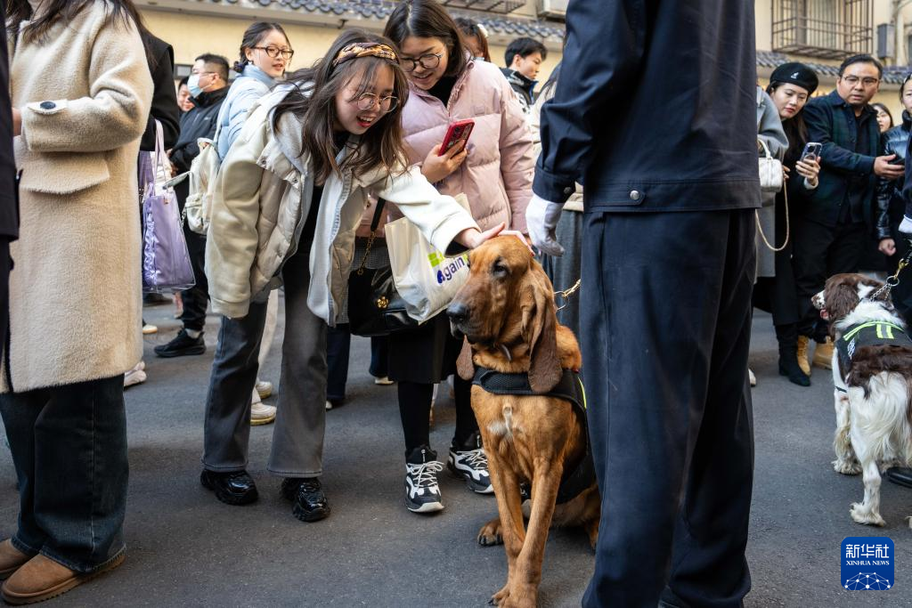 10日、長沙市天心区の坡子街派出所で、警察犬と触れ合う市民。(長沙=新華社記者/陳思汗)pagebreak