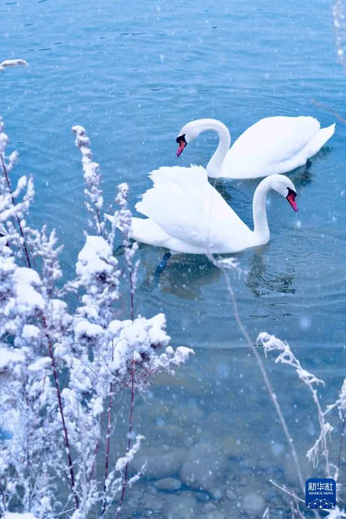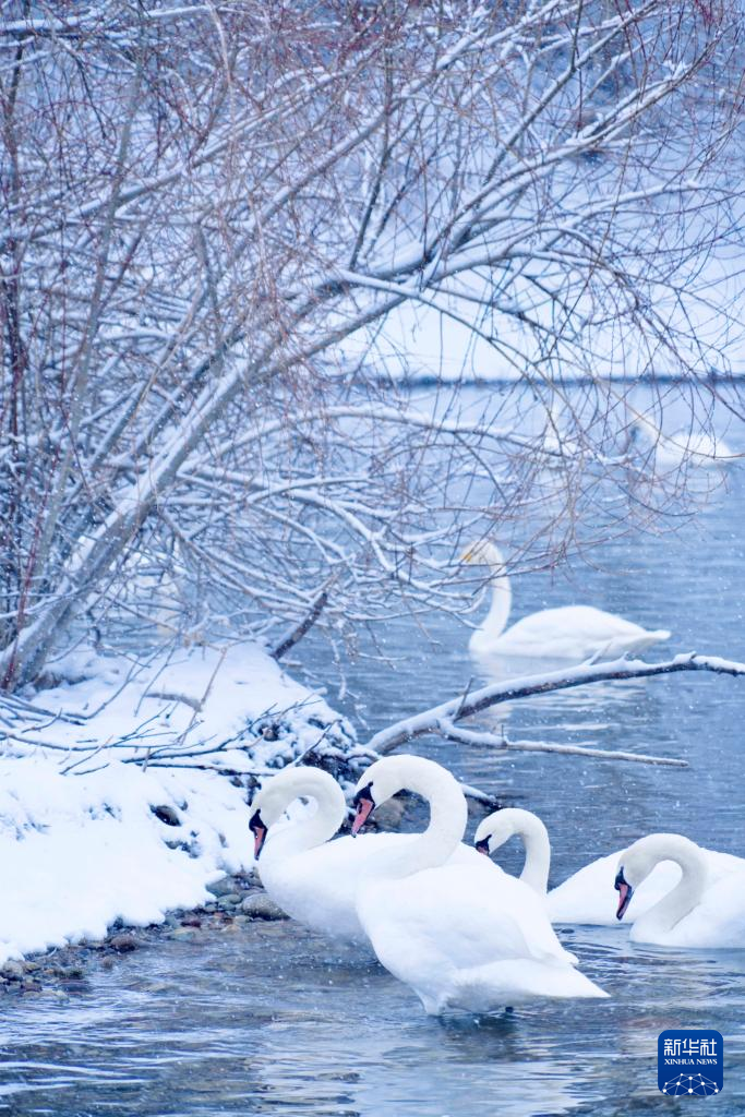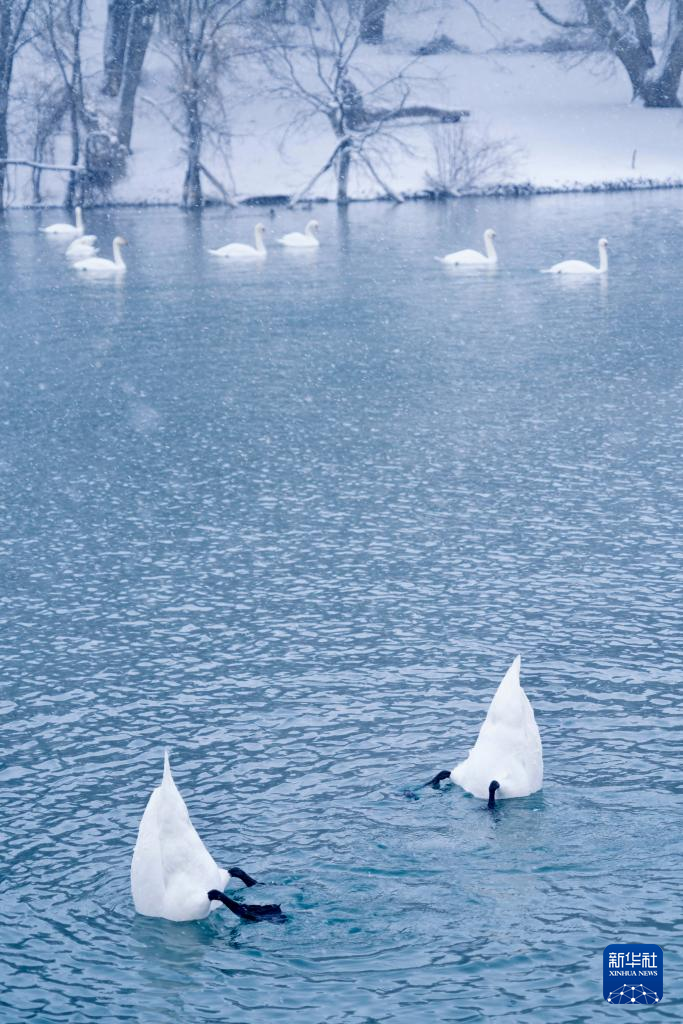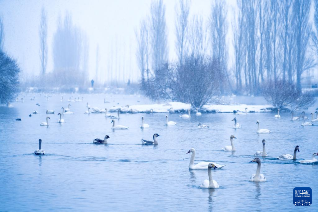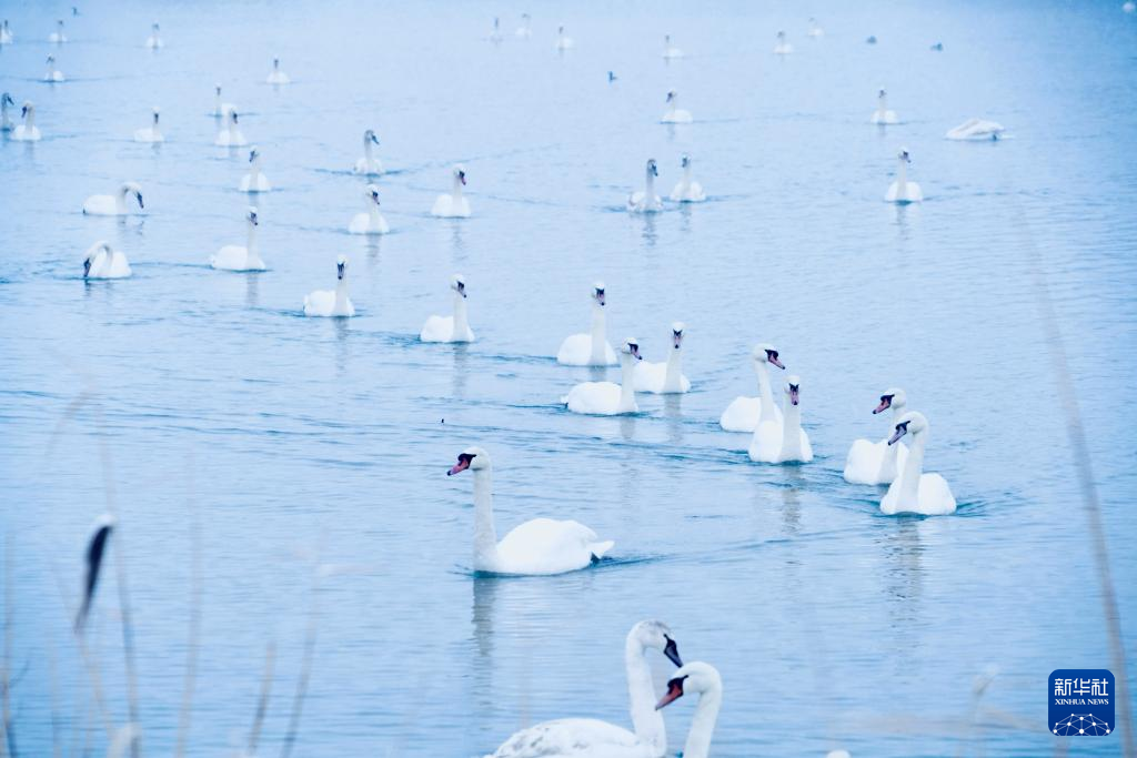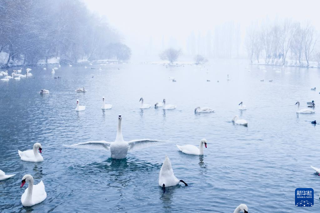 【新華社伊寧1月12日】中国新疆ウイグル自治区イリ・カザフ自治州伊寧(グルジャ)県の天鵝泉湿地公園は冬でも水面が凍らないため、多くのハクチョウが飛来する。公園職員によると、現在800羽近くが滞在しているという。pagebreak