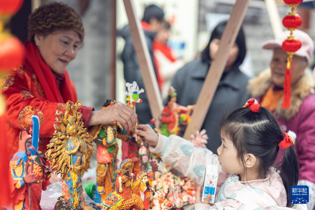21日、重慶市巴南区の西流沱小鎮で面塑(しん粉細工)を子どもに贈る無形文化遺産伝承者。(重慶=新華社記者/黄偉)