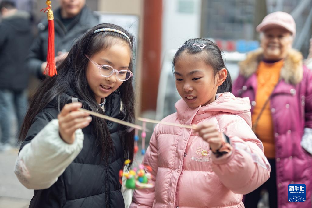 21日、重慶市巴南区の西流沱小鎮で無形文化遺産の面塑(しん粉細工)を手にした子どもたち。(重慶=新華社記者/黄偉)pagebreak