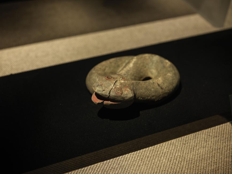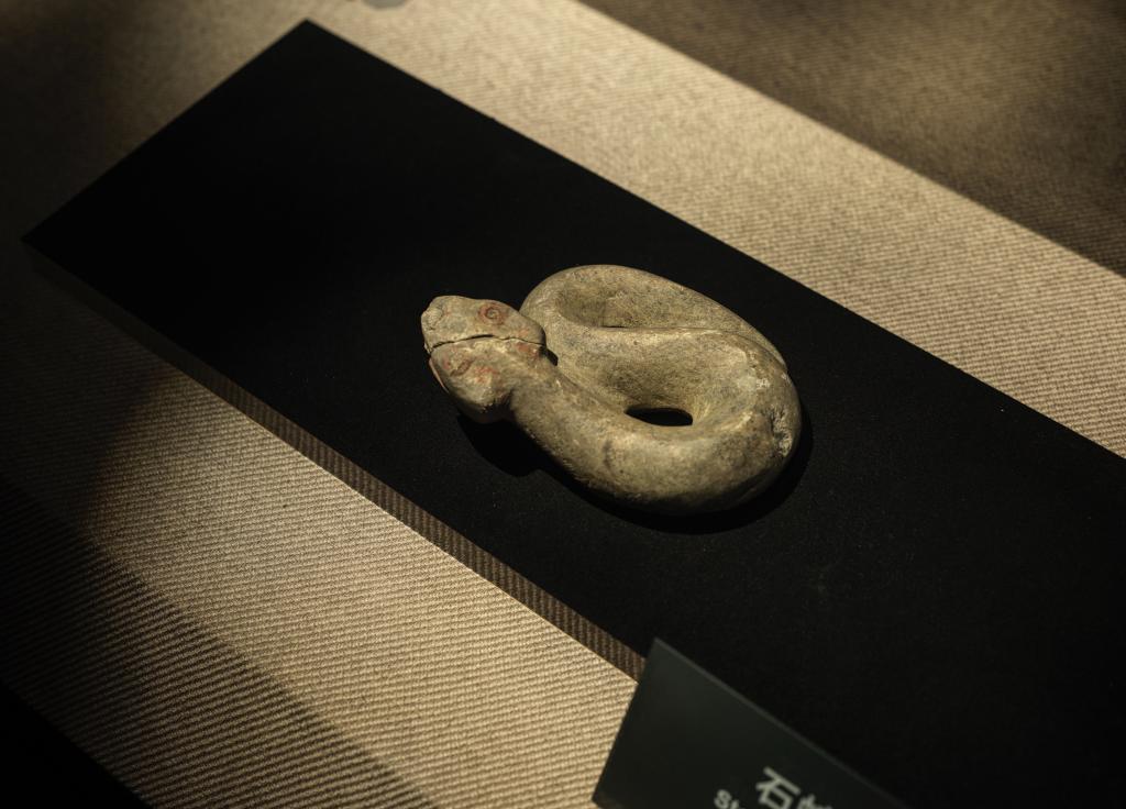 1月23日、四川省広漢市の三星堆博物館に展示されている石蛇(商代)。(成都=新華社記者/薛晨)