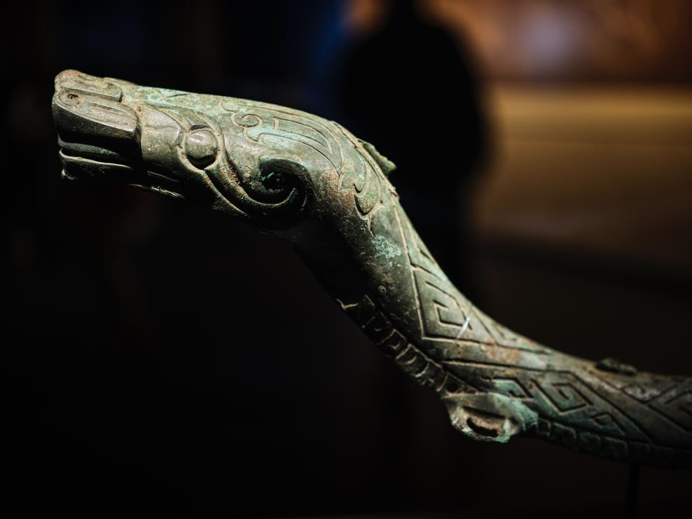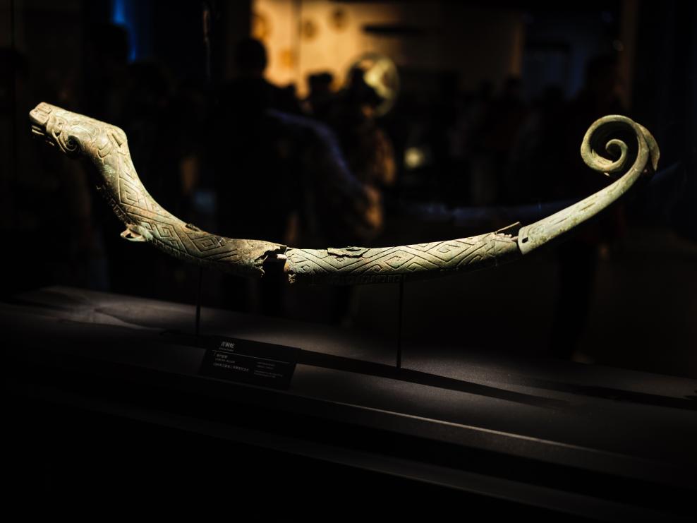 1月23日、四川省広漢市の三星堆博物館に展示されている青銅蛇(商代)。 (成都=新華社記者/薛晨)