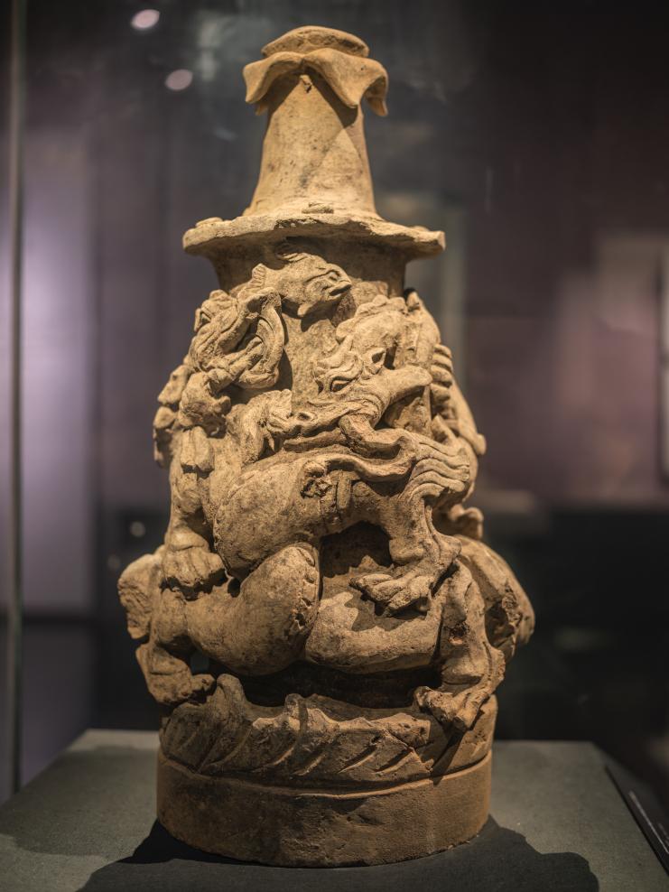1月23日、四川省成都市の成都博物館に展示されている陶盤竜銜蛇座(とうばんりゅうかんじゃざ、後漢時代、部分)。 (成都=新華社記者/薛晨)