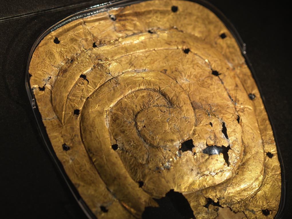 1月23日、四川省成都市の金沙遺跡博物館に展示されている蛇文円角梯形金箔(じゃもんえんかくていけいきんぱく、商周時代)。 (成都=新華社記者/薛晨)