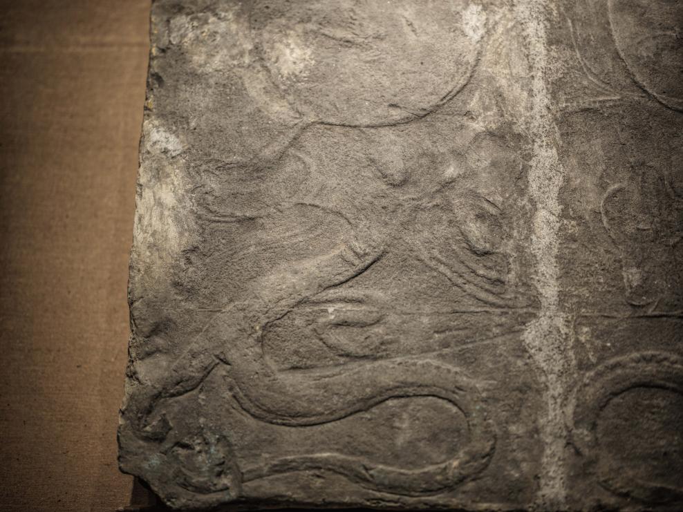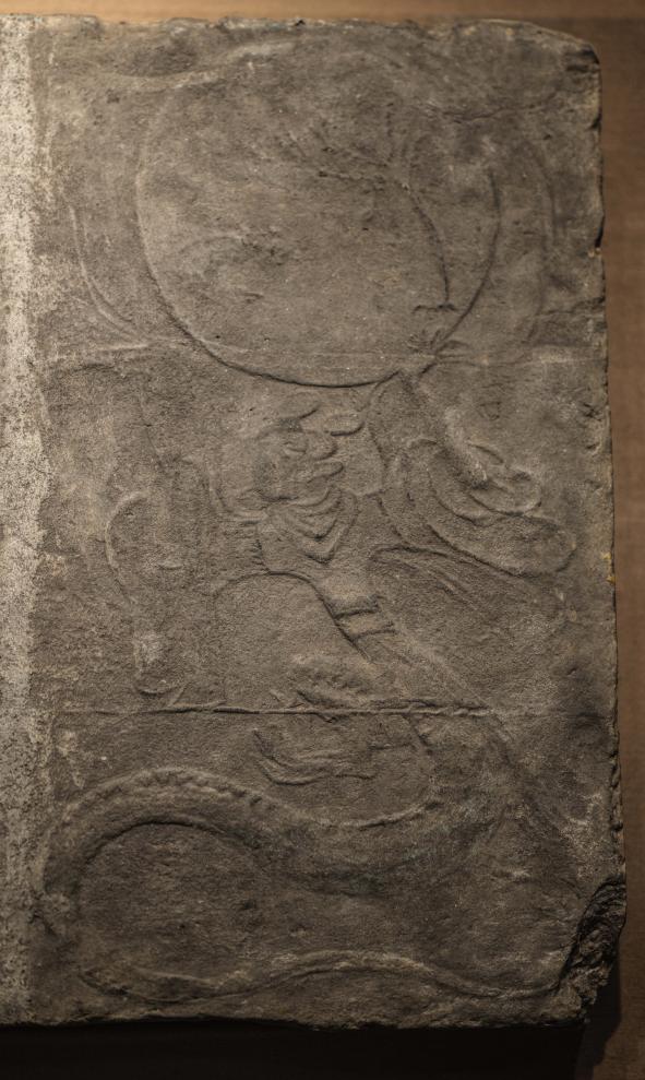 1月23日、四川省成都市の成都博物館に展示されている伏羲女媧画像磚(ふくぎじょかがぞうせん、後漢時代、部分)。(成都=新華社記者/薛晨)