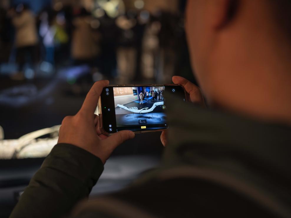 1月23日、四川省広漢市の三星堆博物館で、青銅蛇を撮影する人。 (成都=新華社記者/薛晨)