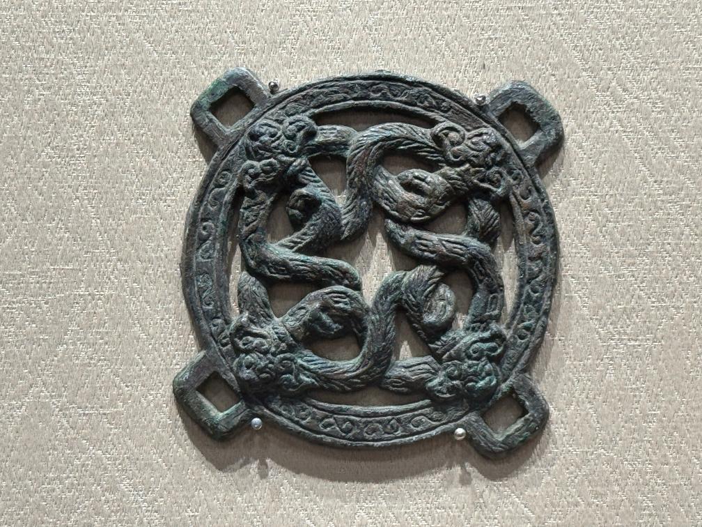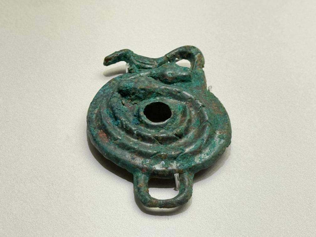 山西博物院に展示された東周時代の蟠蛇文銅当盧(ばんじゃもんどうとうろ)。当盧は馬の頭に付ける飾りで、蛇文様で平安順調を祈願している。(1月22日撮影、太原=新華社記者/王学濤)