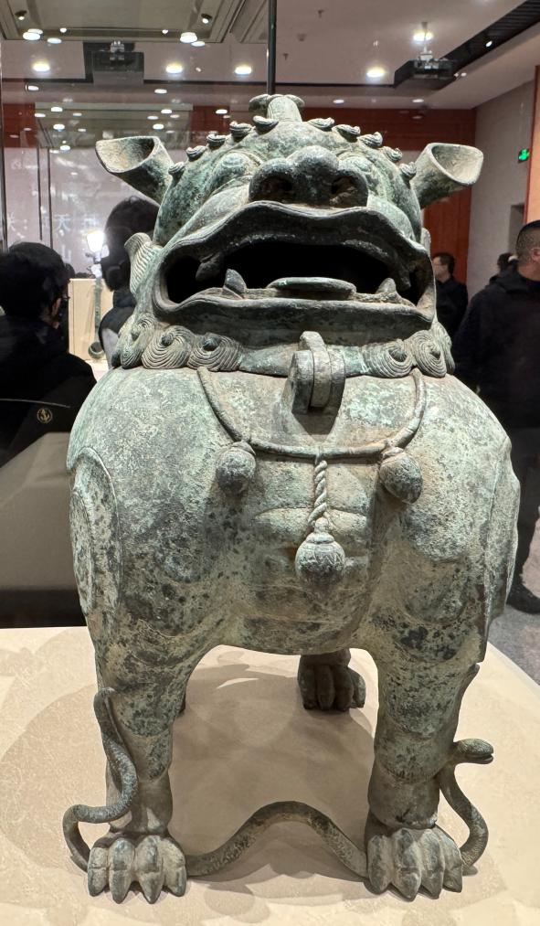 山西博物院に展示された明代の甪端銅熏炉(ろくたんどうくんろ)。蛇を踏む神獣の甪端には、邪気をはらう意味が込められている。(1月22日撮影、太原=新華社記者/王学濤)