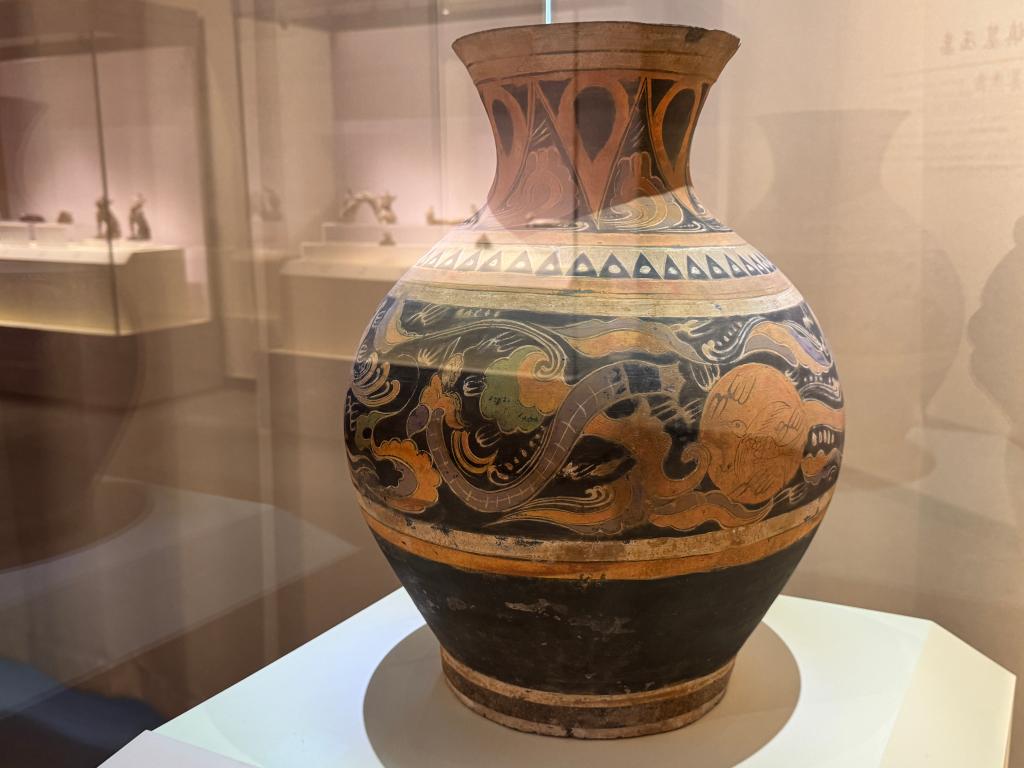 1日、太原文廟(孔子廟)に展示された、山西省考古研究院が所蔵する漢代の彩絵陶壺。人面蛇身の文様が描かれている。(太原=新華社記者/王学濤)