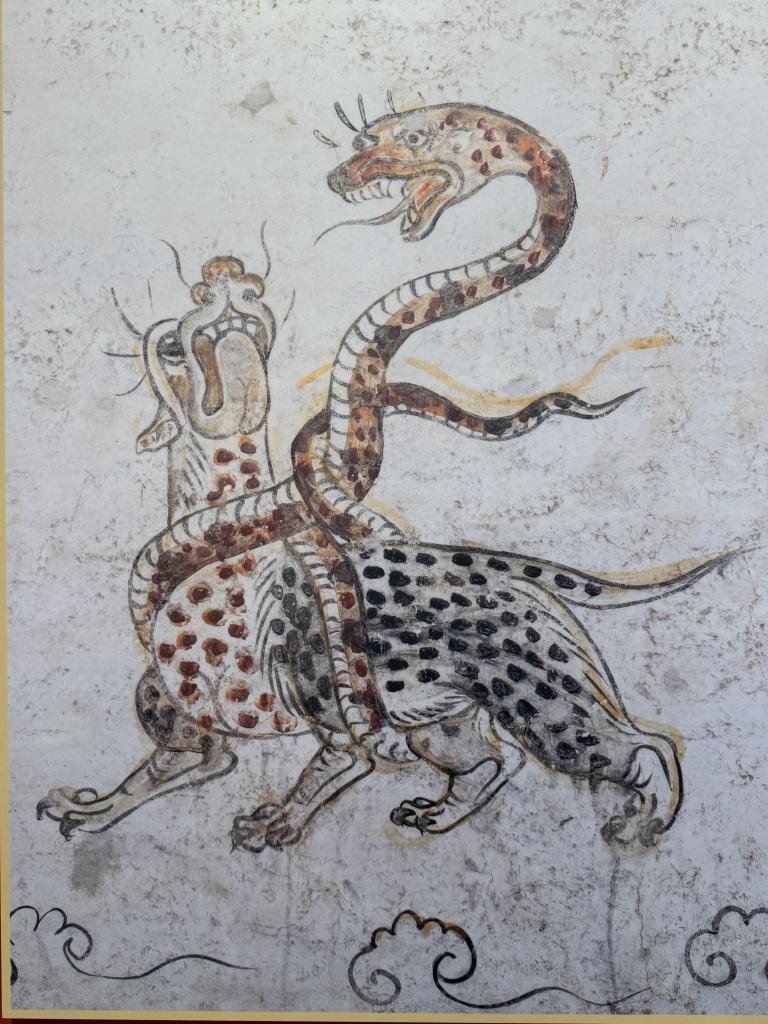 1日、太原文廟(孔子廟)に展示された、山西省考古研究院が所蔵する唐代の玄武壁画。(太原=新華社記者/王学濤)