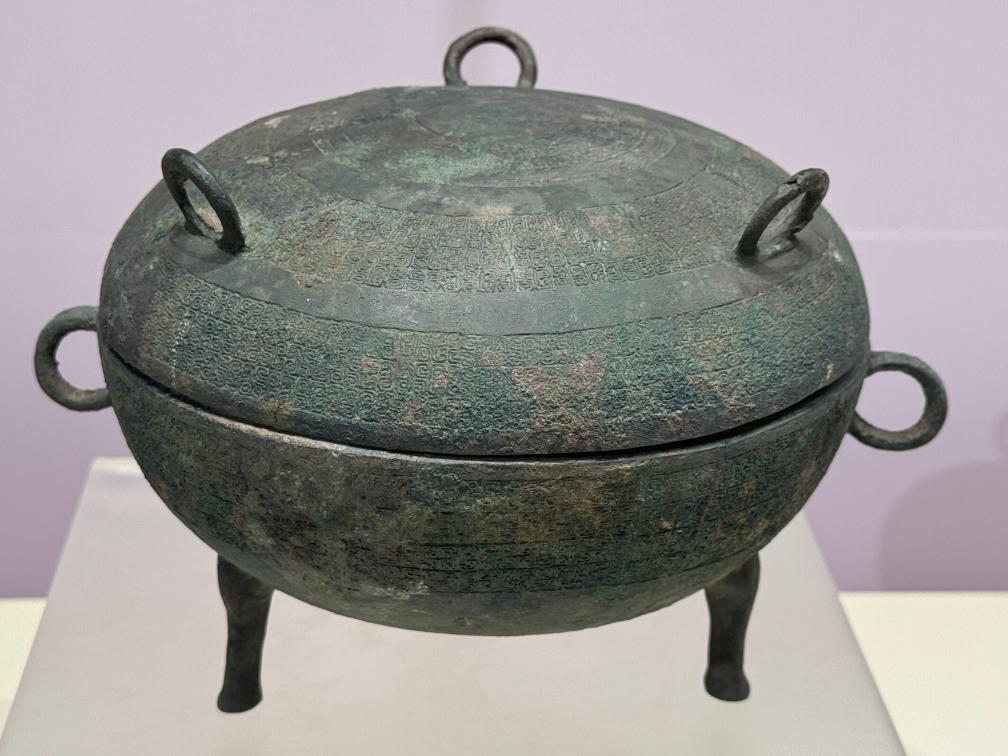 1日、太原文廟(孔子廟)に展示された、山西省考古研究院が所蔵する春秋時代の蟠虺文銅敦(ばんきもんどうたい、礼器・盛食器)。(太原=新華社記者/王学濤)
