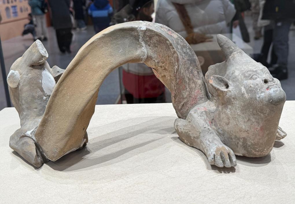 山西博物院に展示された唐代の蛇身人首陶俑。(1月22日撮影、太原=新華社記者/王学濤)