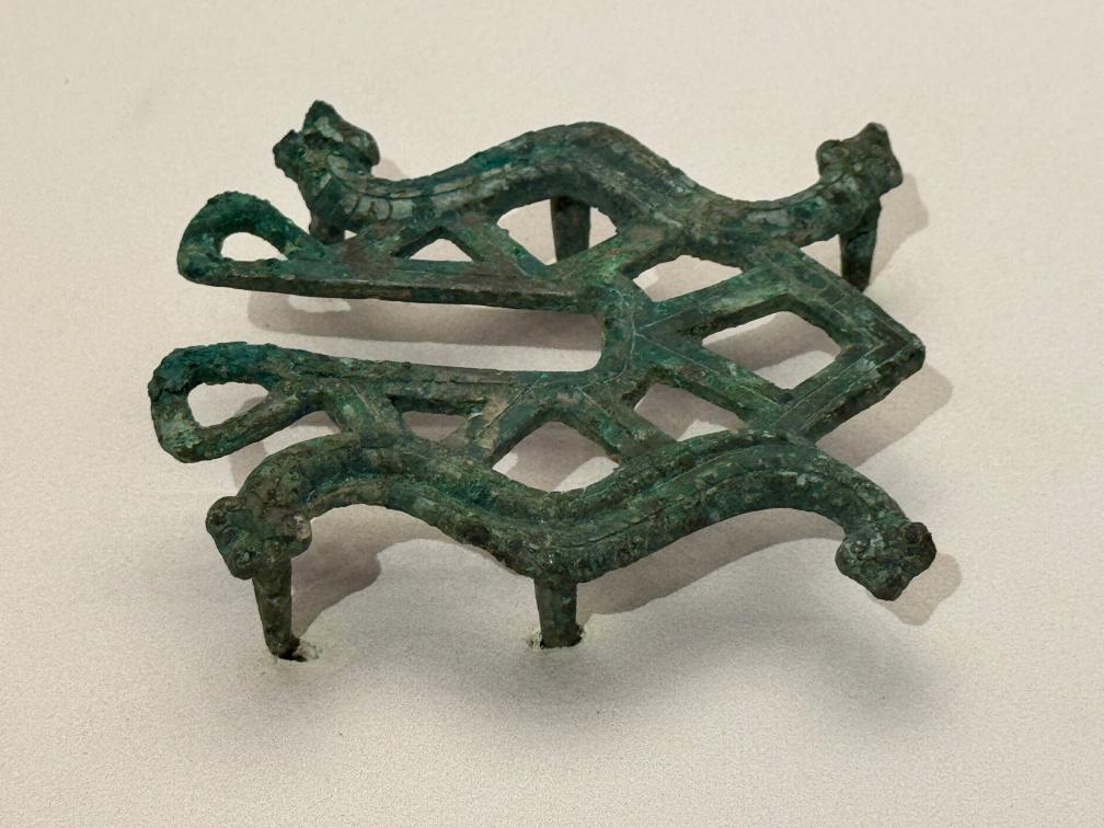 1日、太原文廟(孔子廟)に展示された、山西省考古研究院が所蔵する西周時代の蛇鳥文鑣(じゃちょうもんひょう、馬のくつわ)。(太原=新華社記者/王学濤)