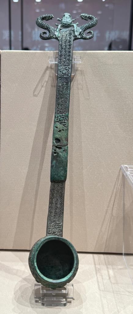 山西博物院に展示された、山西省で出土した商(殷)代の蛇首扁柄斗(じゃしゅへんへいと、酒器)。(1月22日撮影、太原=新華社記者/王学濤)