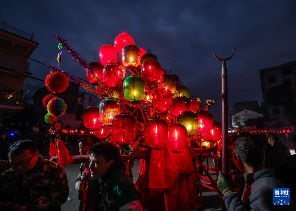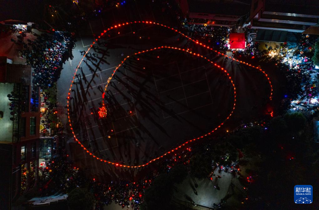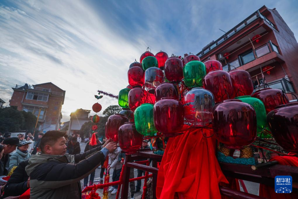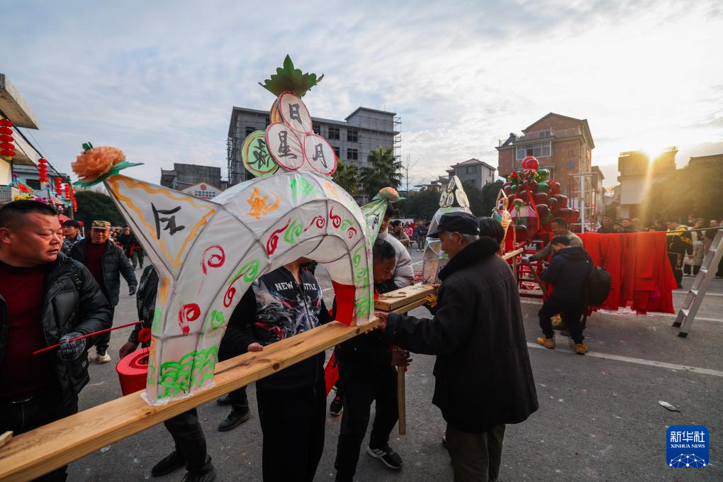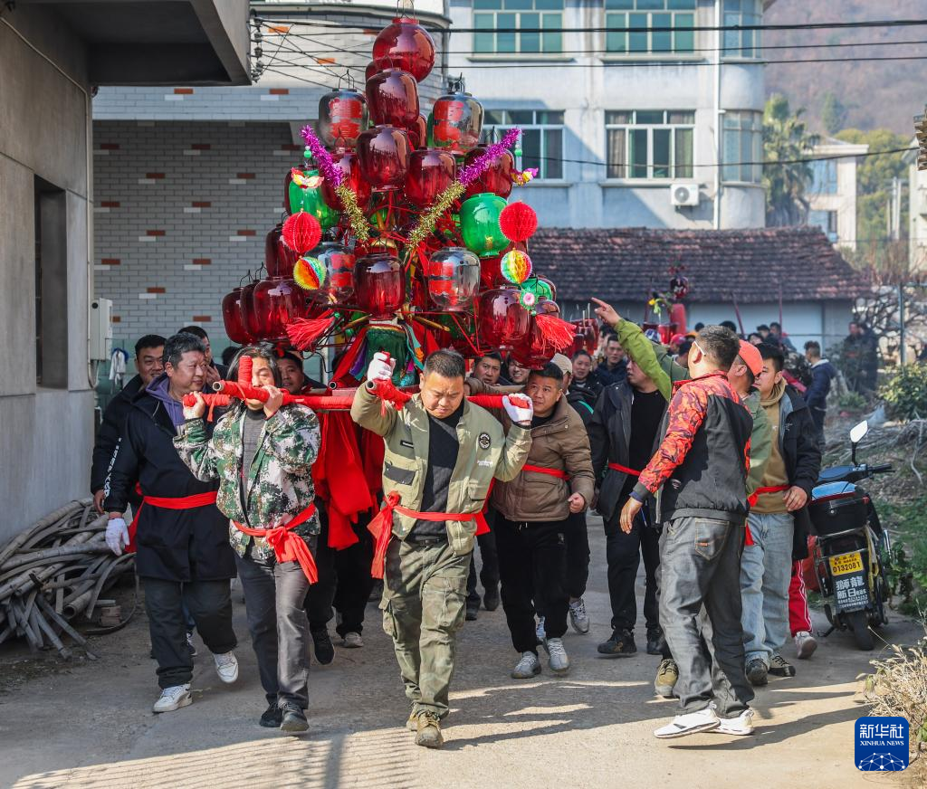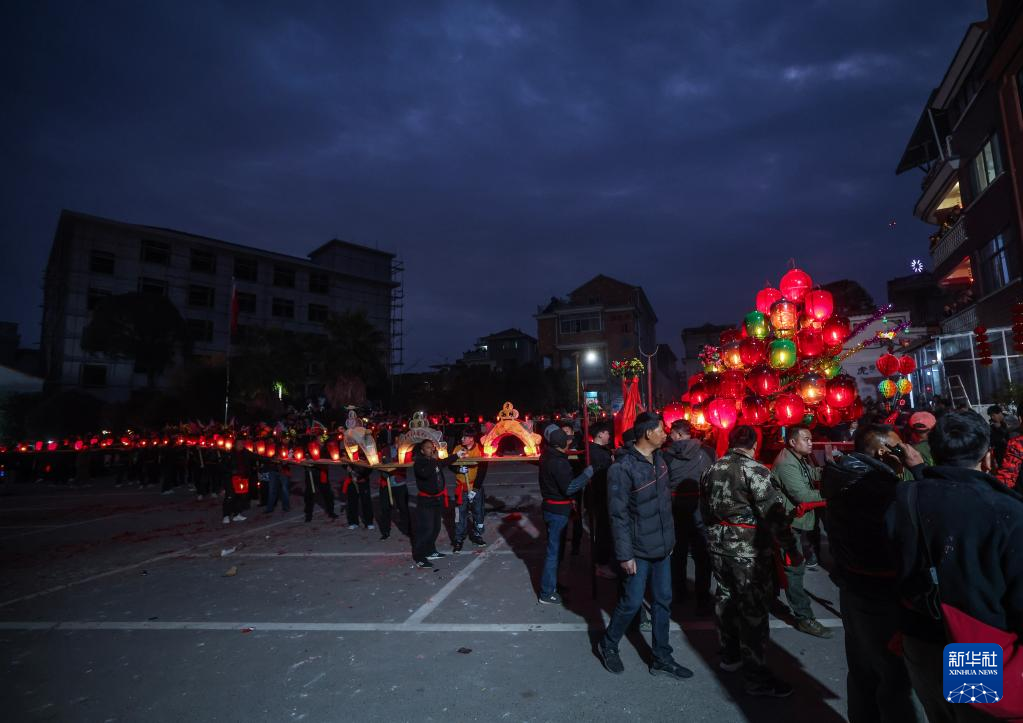 【新華社金華2月12日】中国浙江省金華市赤松鎮虎岩村で旧暦1月13日に当たる10日、村人たちが100個以上の腰掛け椅子を連ねて作った巨大な竜「板凳竜」を担いで村の中を練り歩いた。