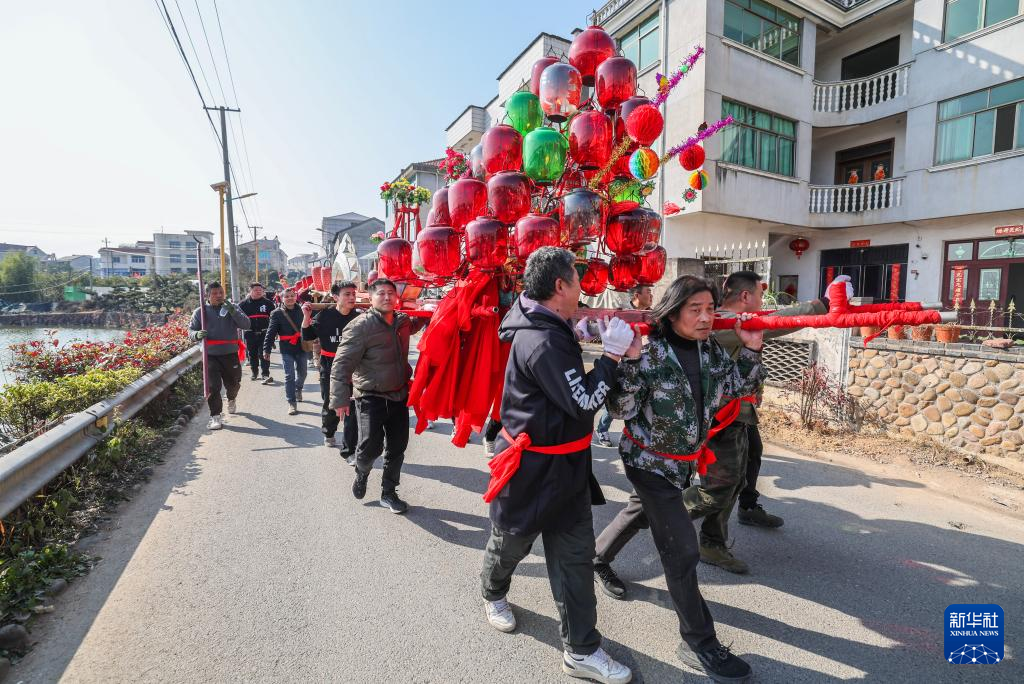 10日、板凳竜を担ぎ、村を練り歩く村人。(金華=新華社記者/徐昱)