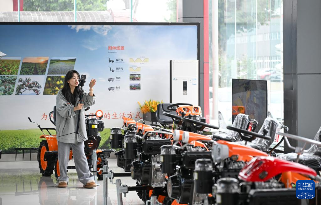 22日、重慶華世丹機械製造の展示ホールで、ライブ配信を通じて製品を紹介する販売担当者。(重慶=新華社記者/王全超)