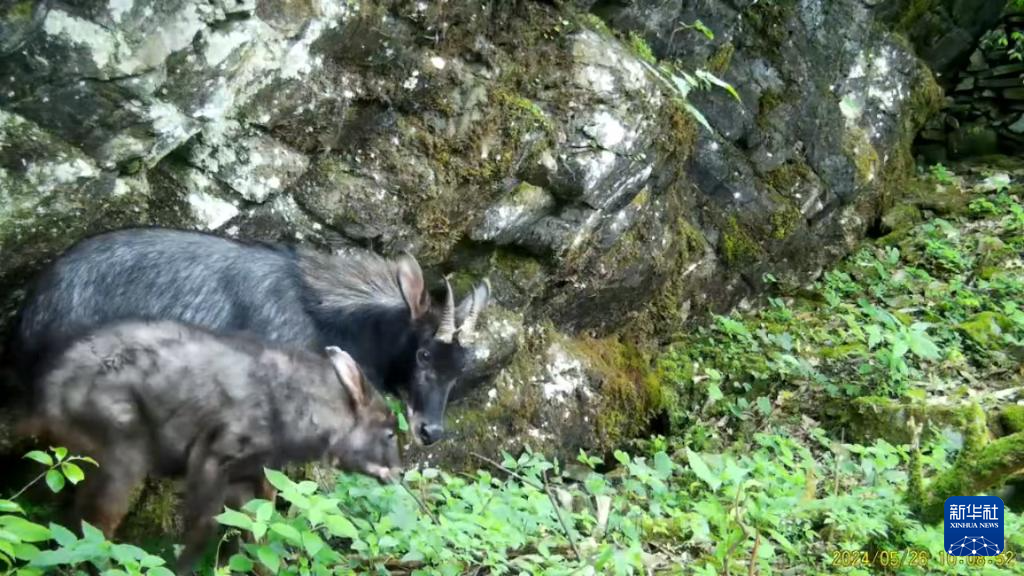 貴州省の梵浄山で赤外線カメラが捉えた国家2級保護野生動物・チュウゴクカモシカの親子。(2024年9月撮影、貴陽=新華社配信)