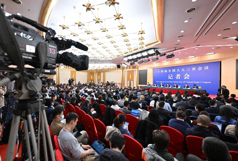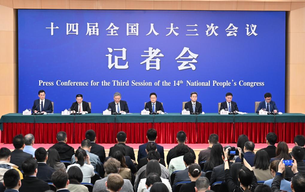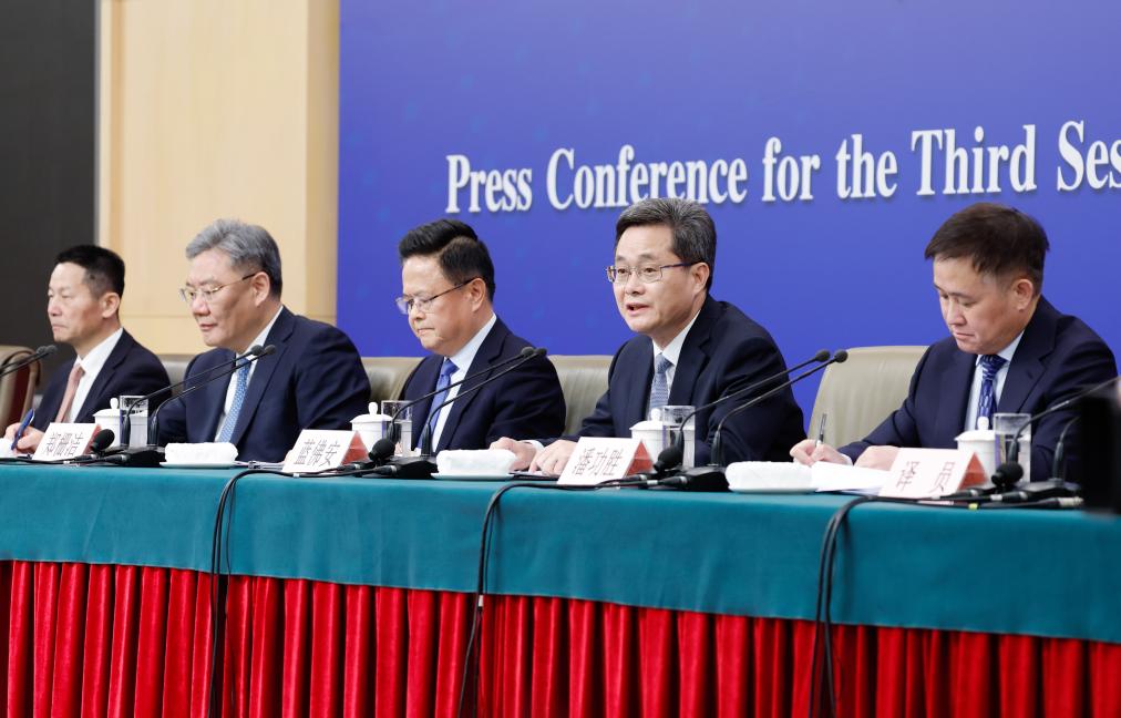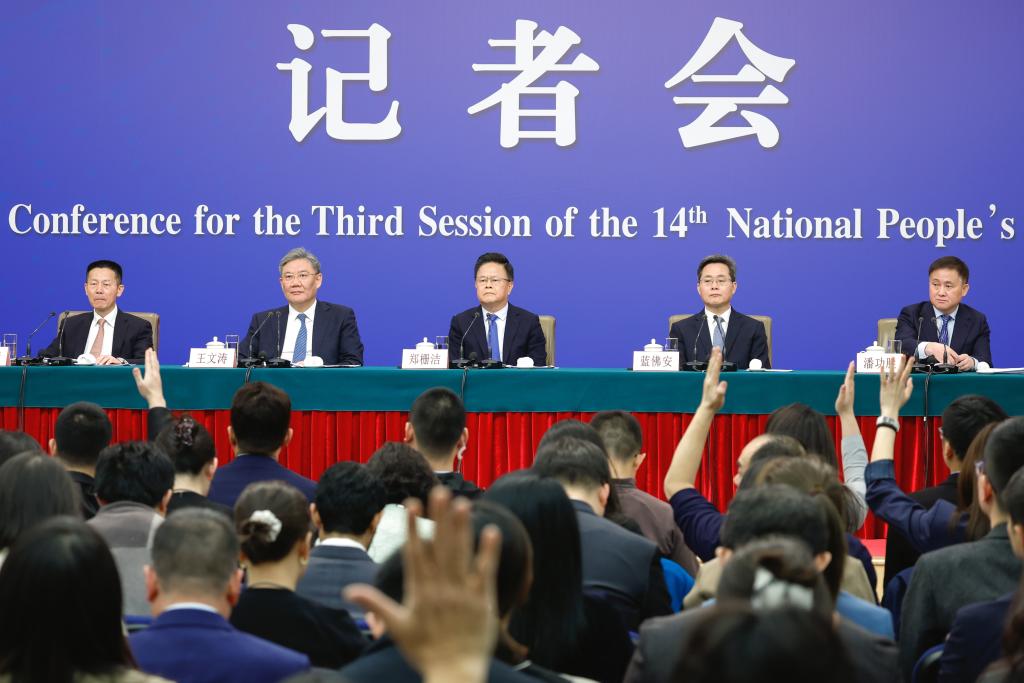 中国の第14期全国人民代表大会(全人代)第3回会議は6日、北京市内の複合施設、梅地亜中心(メディアセンター)で記者会見を開き、鄭柵潔(てい・さんけつ)国家発展改革委員会主任、藍仏安(らん・ふつあん)財政部長、王文濤(おう・ぶんとう)商務部長、潘功勝(はん・こうしょう)中国人民銀行総裁、呉清(ご・せい)中国証券監督管理委員会主席が発展と改革、財政予算、ビジネス、金融証券などについて内外の記者の質問に答えた。(北京=新華社記者/胥氷潔)