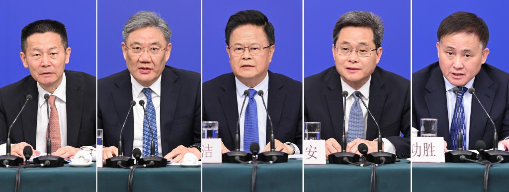 中国の第14期全国人民代表大会(全人代)第3回会議は6日、北京市内の複合施設、梅地亜中心(メディアセンター)で記者会見を開き、鄭柵潔(てい・さんけつ)国家発展改革委員会主任、藍仏安(らん・ふつあん)財政部長、王文濤(おう・ぶんとう)商務部長、潘功勝(はん・こうしょう)中国人民銀行総裁、呉清(ご・せい)中国証券監督管理委員会主席が発展と改革、財政予算、ビジネス、金融証券などについて内外の記者の質問に答えた。(組み合わせ写真、北京=新華社記者/胥氷潔)