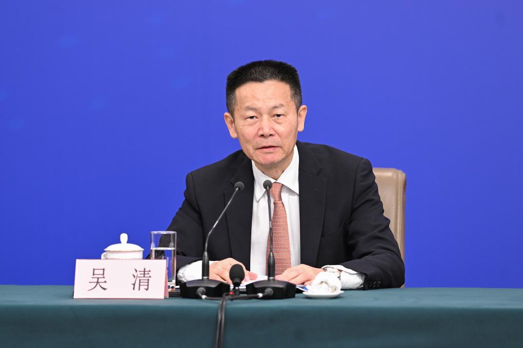 中国の第14期全国人民代表大会(全人代)第3回会議は6日、北京市内の複合施設、梅地亜中心(メディアセンター)で記者会見を開き、鄭柵潔(てい・さんけつ)国家発展改革委員会主任、藍仏安(らん・ふつあん)財政部長、王文濤(おう・ぶんとう)商務部長、潘功勝(はん・こうしょう)中国人民銀行総裁、呉清(ご・せい)中国証券監督管理委員会主席が発展と改革、財政予算、ビジネス、金融証券などについて内外の記者の質問に答えた。写真は記者の質問に答える呉清・中国証券監督管理委員会主席。(北京=新華社記者/胥氷潔)