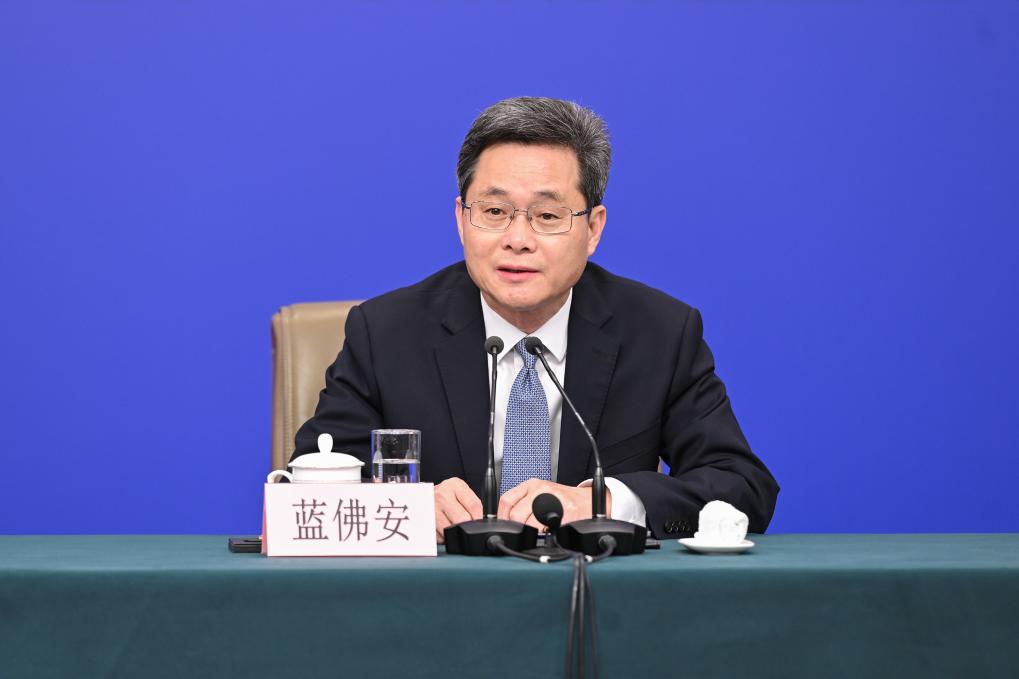 中国の第14期全国人民代表大会(全人代)第3回会議は6日、北京市内の複合施設、梅地亜中心(メディアセンター)で記者会見を開き、鄭柵潔(てい・さんけつ)国家発展改革委員会主任、藍仏安(らん・ふつあん)財政部長、王文濤(おう・ぶんとう)商務部長、潘功勝(はん・こうしょう)中国人民銀行総裁、呉清(ご・せい)中国証券監督管理委員会主席が発展と改革、財政予算、ビジネス、金融証券などについて内外の記者の質問に答えた。(北京=新華社記者/張玉薇)