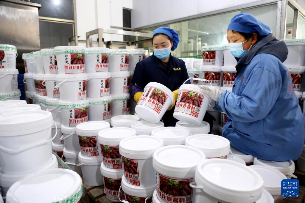 8日、ザリガニ料理の調味料を製造する盱眙県のメーカーで働く従業員。(淮安=新華社配信/王春)