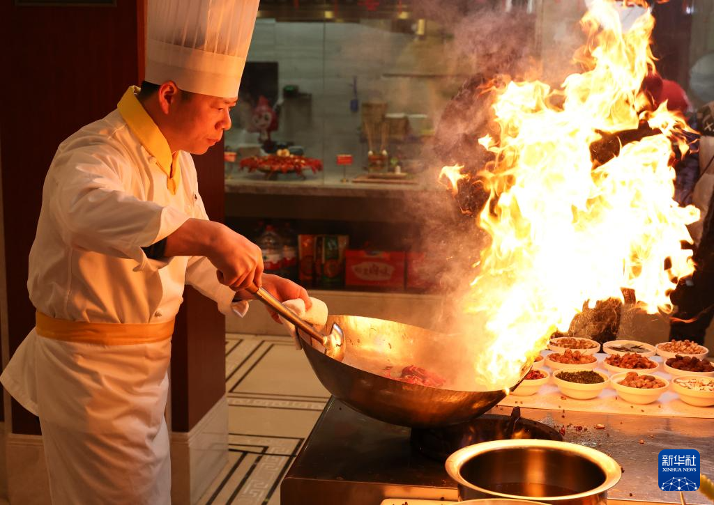 8日、盱眙県の店でザリガニを調理する料理人。(淮安=新華社配信/王健民)