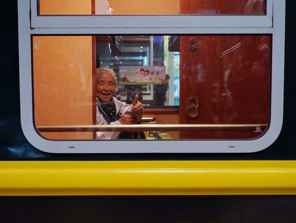 15日、北京豊台駅に停車中のシルバー観光列車「京鉄楽遊」号の車内から撮影に応じる乗客。(北京=新華社記者/張晨霖)