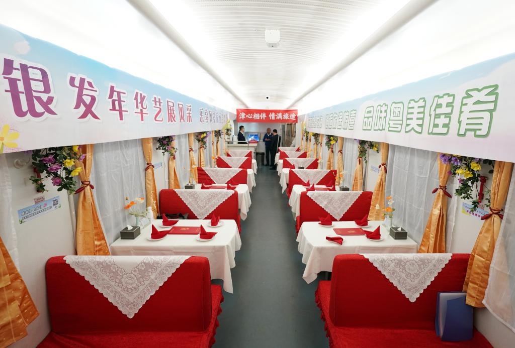 15日、シルバー観光列車「京鉄楽遊」号の食堂車。(北京=新華社記者/張晨霖)