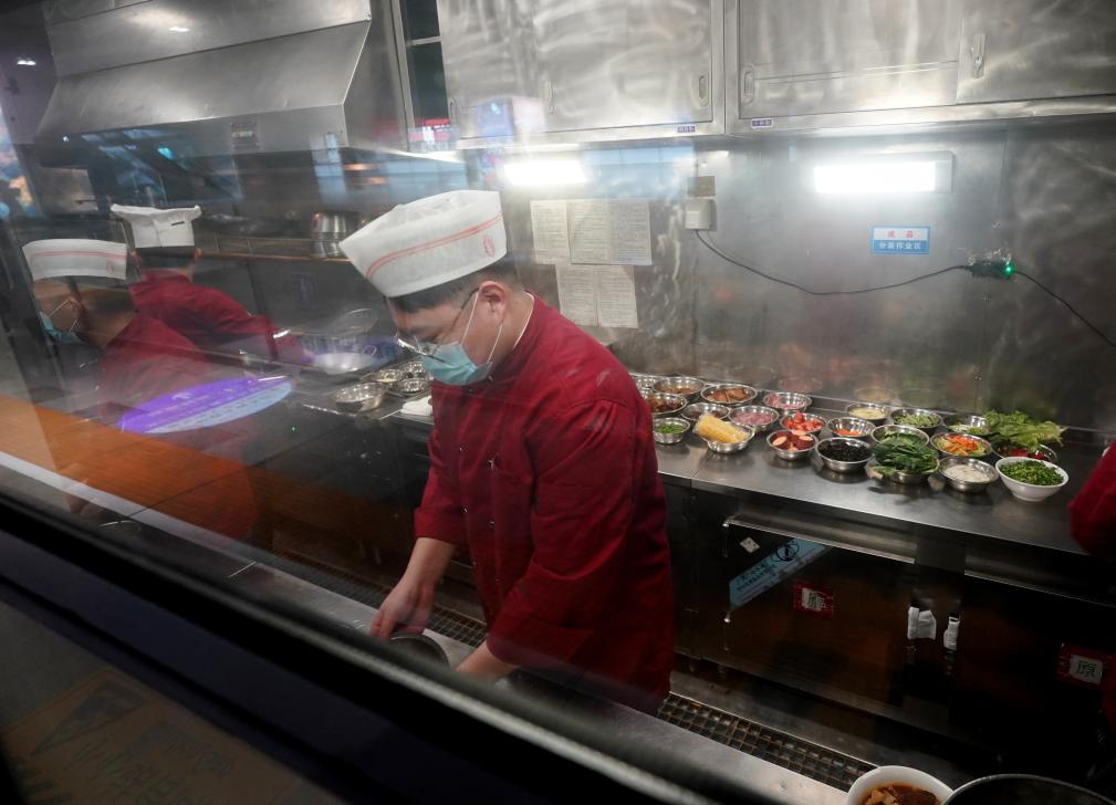 15日、シルバー観光列車「京鉄楽遊」号の厨房で準備をする料理人たち。(北京=新華社記者/張晨霖)
