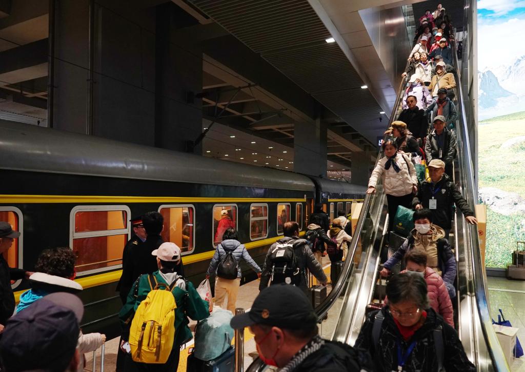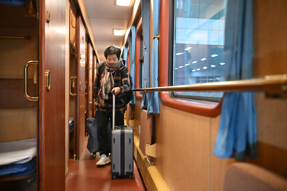 15日、北京豊台駅で、シルバー観光列車「京鉄楽遊」号に向かう乗客たち。(北京=新華社記者/張晨霖)