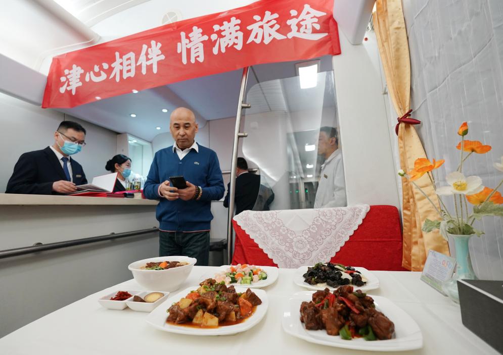 15日、シルバー観光列車「京鉄楽遊」号の食堂車で提供される料理。(北京=新華社記者/張晨霖)